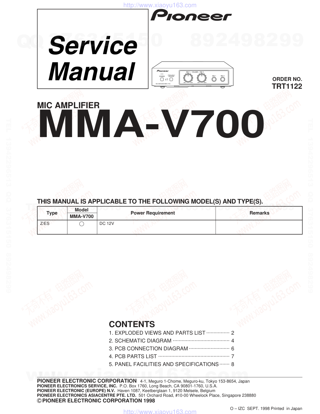 ORDER NO. PIONEER ELECTRONIC CORPORATION 4-1, Meguro 1-Chome, Meguro-ku, Tokyo 153-8654, Japan PIONEER ELECTRONICS SERVICE, INC. P.O. Box 1760, Long Beach, CA 90801-1760, U.S.A. PIONEER ELECTRONIC (EUROPE) N.V. Haven 1087, Keetberglaan 1, 9120 Melsele, Belgium PIONEER ELECTRONICS ASIACENTRE PTE. LTD. 501 Orchard Road, #10-00 Wheelock Place, Singapore 238880 � � � � � � � � � �PIONEER ELECTRONIC CORPORATION 1998 c MMA-V700 TRT1122 1. EXPLODED VIEWS AND PARTS LIST ................ 2 2. SCHEMATIC DIAGRAM ....................................... 4 3. PCB CONNECTION DIAGRAM ............................ 6 4. PCB PARTS LIST ................................................. 7 5. PANEL FACILITIES AND SPECIFICATIONS....... 8 CONTENTS O – IZC SEPT. 1998 Printed in Japan Type Model Power Requirement Remarks MMA-V700 Z/ES DC 12V THIS MANUAL IS APPLICABLE TO THE FOLLOWING MODEL(S) AND TYPE(S). MIC AMPLIFIER www. xiaoyu163. com QQ 376315150 9 9 2 8 9 4 2 9 8 TEL 13942296513 9 9 2 8 9 4 2 9 8 0 5 1 5 1 3 6 7 3 Q Q TEL 13942296513 QQ 376315150 892498299 TEL 13942296513 QQ 376315150 892498299 http://www.xiaoyu163.com 2 MMA-V700 1.1 PACKING • PACKING PARTS LIST Mark No. Description Part No. 1. EXPLODED VIEWS AND PARTS LIST NOTES: • Parts marked by "NSP" are generally unavailable because they are not in our Master Spare Parts List. • The mark found on some component parts indicates the importance of the safety factor of the part. Therefore, when replacing, be sure to use parts of identical designation. • Screws adjacent to mark on the product are used for disassembly. 1 2 3 6 4 5 1 Microphone Output Cable MDE1066 2 Operating Instructions MRB1026 (English/Chinese) 3 Packing Case MHG1206 4 Inner Partition MHG1207 5 Mirror Mat Sheet MHL1021 6 Master Carton MHP1095 www. xiaoyu163. com QQ 376315150 9 9 2 8 9 4 2 9 8 TEL 13942296513 9 9 2 8 9 4 2 9 8 0 5 1 5 1 3 6 7 3 Q Q TEL 13942296513 QQ 376315150 892498299 TEL 13942296513 QQ 376315150 892498299 http://www.xiaoyu163.com 3 MMA-V700 1 2 12 12 3 Including VR1 and VR2 on the MAIN BOARD Assy. 4 4 5 6 7 10 11 8 9 10 10 10 VR1 VR2 1 MAIN Board Assy MWX1089 NSP 2 LED Board Assy MWX1090 3 Rotary Knob AAB1063 4 Foot MEP1043 5 Bonnet MNA1065 6 Chassis MNA1117 7 Panel MNK1279 8 Button MNK3082 9 Screw BBZ30P060FMC 10 Screw BBZ30P060FZK 11 Screw BMZ30P060FMC 12 Screw BPZ30P080FZK 1.2 MAIN SECTION • MAIN SECTION PARTS LIST Mark No. Description Part No. www. xiaoyu163. com QQ 376315150 9 9 2 8 9 4 2 9 8 TEL 13942296513 9 9 2 8 9 4 2 9 8 0 5 1 5 1 3 6 7 3 Q Q TEL 13942296513 QQ 376315150 892498299 TEL 13942296513 QQ 376315150 892498299 http://www.xiaoyu163.com MMA-V700 4 A B C D 1 2 3 4 1 2 3 4 A C10 2200p R12 33k R22 33k GND JA1 MKN1004 R10 470 C11 4.7/50 R11 56k R14 330 C13 22/16 R24 330 C23 22/16 TP1 MAIN BOARD ASSY (MWX1089) TP2 GND GND 1/2 GND +9V GND C56 22/16 C14 10/50 R15 1k R16 2.2k VR1 MCS1007 MIC 1 VOLUME R59 1k C24 10/50 R25 1k R26 2.2k VR2 MCS1007 MIC 2 VOLUME R60 1k R13 6.8k C12 330p IC1 M5218AL GND GND C30 1000p GND GND GND 1/2 GND +9V GND GND GND GND C20 2200p GND GND GND 2/2 GND GND MIC1 JA2 MKN1004 R20 470 C21 4.7/50 R21 56k TP3 TP4 MIC2 JA3 (1/2) MKN1021 R30 1k C31 10/50 R32 10k R31 100k TP5 TP6 LINE IN 3 2 8 4 1 IC2 M5218AL C57 22/16 R33 10k C32 220p C33 4.7/50 R37 1k R35 10k R34 47k R57 620 R58 620 Q1 2SD2144S 3 2 8 4 1 IC1 M5218AL R23 6.8k C22 330p 5 6 7 1 4 2 1 4 2 A 2. SCHEMATIC DIAGRAM www. xiaoyu163. com QQ 376315150 9 9 2 8 9 4 2 9 8 TEL 13942296513 9 9 2 8 9 4 2 9 8 0 5 1 5 1 3 6 7 3 Q Q TEL 13942296513 QQ 376315150 892498299 TEL 13942296513 QQ 376315150 892498299 http://www.xiaoyu163.com MMA-V700 5 A B C D 5 6 7 8 5 6 7 8 Note : When ordering service parts, be sure to refer to "EXPLODED VIEWS and PARTS LIST" or "PCB PARTS LIST". R38 1k C34 4.7/50 C35 150p SW2 MSG1011 C36 470p TP22 TP23 C50 100/16 R51 10k R50 10k GND GND 1 2 4 3 GND 2/2 GND GND GND GND GND 1 2 3 1 2 3 1 2 3 OUT COM IN GND GND GND GND GND IC2 M5218AL C37 10/50 R41 100 R52 330 R40 47k R39 13k 6 1 4 2 5 3 6 5 7 T1 MTT1021 R36 2.2k C54 0.1 +9V TP15 IC3 NJM78M09FA C59 0.1 TP16 TP20 D2 RD6R2JS Q2 2SC2458 C58 0.1 C51 470/16 R55 10k D1 1SS133 R53 47k C52 33/16 R54 220k C53 1000 /25 1 3 2 TP21 TP9 TP10 JA3 (2/2) MKN1021 LINE OUT AC ADAPTER DC IN 12V TP11 TP12 MDD3006 SW1 MSG1006 6 3 5 2 4 1 1 3 2 GND R56 100 TP17 TP18 D3 ERA15-02VH GND JA4 MKN1023 JA6 MKN1019 J1 MKX1007 TP7 TP8 TP19 MIC MIX OUT GND FG LED BOARD ASSY (MWX1090) TP14 TP13 D4 TLG208 (POWER) B SWITCHES SW1: POWER SW2: FREQUENCY BOOSTER CN1 MKP1021 B A www. xiaoyu163. com QQ 376315150 9 9 2 8 9 4 2 9 8 TEL 13942296513 9 9 2 8 9 4 2 9 8 0 5 1 5 1 3 6 7 3 Q Q TEL 13942296513 QQ 376315150 892498299 TEL 13942296513 QQ 376315150 892498299 http://www.xiaoyu163.com MMA-V700 6 A B C D 1 2 3 4 1 2 3 4 MAIN BOARD ASSY A LED BOARD ASSY B IC3 Q2 IC1 Q1 IC2 VR1 VR2 NOTE FOR PCB DIAGRAMS : 1. Part numbers in PCB diagrams match those in the schematic diagrams. 2. View point of PCB diagrams. Capacitor Connector P.C.Board Chip Part SIDE A SIDE B SIDE B (MNP1098-A) (MNP1097-A) 3. PCB CONNECTION DIAGRAM B A www. xiaoyu163. com QQ 376315150 9 9 2 8 9 4 2 9 8 TEL 13942296513 9 9 2 8 9 4 2 9 8 0 5 1 5 1 3 6 7 3 Q Q TEL 13942296513 QQ 376315150 892498299 TEL 13942296513 QQ 376315150 892498299 http://www.xiaoyu163.com 7 MMA-V700 Mark No. Description Part No. Mark No. Description Part No. LIST OF ASSEMBLIES Mark No. Description Part No. Mark No. Description Part No. 4. PCB PARTS LIST NOTES: •Parts marked by "NSP" are generally unavailable because they are not in our Master Spare Parts List. •The mark found on some component parts indicates the importance of the safety factor of the part. Therefore, when replacing, be sure to use parts of identical designation. •When ordering resistors, first convert resistance values into code form as shown in the following examples. Ex.1 When there are 2 effective digits (any digit apart from 0), such as 560 ohm and 47k ohm (tolerance is shown by J=5%, and K=10%). 560 Ω → 56 × 10 