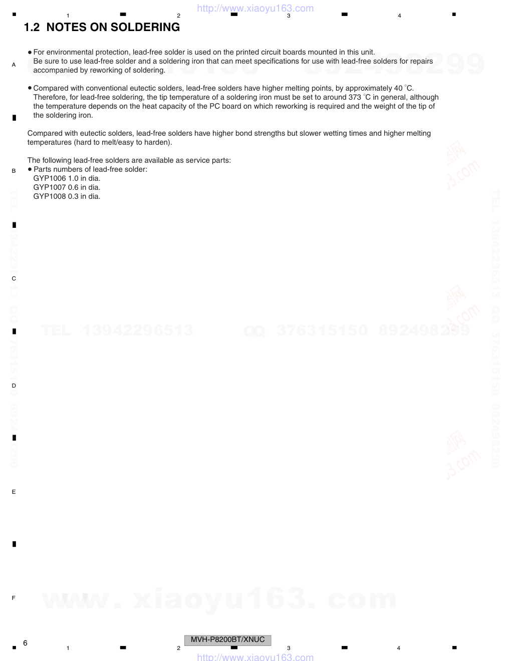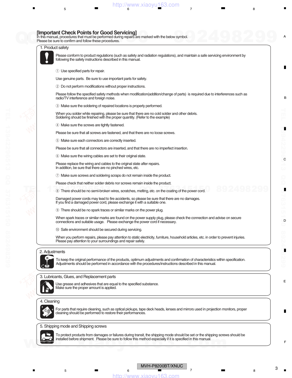 ORDER NO. PIONEER CORPORATION 1-1, Shin-ogura, Saiwai-ku, Kawasaki-shi, Kanagawa 212-0031, Japan PIONEER ELECTRONICS (USA) INC. P.O. Box 1760, Long Beach, CA 90801-1760, U.S.A. PIONEER EUROPE NV Haven 1087, Keetberglaan 1, 9120 Melsele, Belgium PIONEER ELECTRONICS ASIACENTRE PTE. LTD. 253 Alexandra Road, #04-01, Singapore 159936 PIONEER CORPORATION 2010 MVH-P8200BT/XNUC CRT4530 MEDIA CENTER RECEIVER MVH-P8200BT/XNUC MVH-P8200/XNUC RDS MEDIA CENTER RECEIVER MVH-8200BT/XNEW5 MVH-8200/XNEW5 MEDIA CENTER RECEIVER MVH-8250BT/XNES MVH-8250/XNES For details, refer to "Important Check Points for Good Servicing". K-ZZZ FEB. 2010 Printed in Japan www. xiaoyu163. com QQ 376315150 9 9 2 8 9 4 2 9 8 TEL 13942296513 9 9 2 8 9 4 2 9 8 0 5 1 5 1 3 6 7 3 Q Q TEL 13942296513 QQ 376315150 892498299 TEL 13942296513 QQ 376315150 892498299 http://www.xiaoyu163.com MVH-P8200BT/XNUC 2 1 2 3 4 1 2 3 4 C D F A B E SAFETY INFORMATION CAUTION Where in a manufacturer’s service documentation, for example in circuit diagrams or lists of components, a symbol is used to indicate that a specific component shall be replaced only by the component specified in that documentation for safety reasons, the following symbol shall be used: This service manual is intended for qualified service technicians; it is not meant for the casual do-it-yourselfer. Qualified technicians have the necessary test equipment and tools, and have been trained to properly and safely repair complex products such as those covered by this manual. Improperly performed repairs can adversely affect the safety and reliability of the product and may void the warranty. If you are not qualified to perform the repair of this product properly and safely, you should not risk trying to do so and refer the repair to a qualified service technician. WARNING This product may contain a chemical known to the State of California to cause cancer, or birth defects or other reproductive harm. Health & Safety Code Section 25249.6 - Proposition 65 www. xiaoyu163. com QQ 376315150 9 9 2 8 9 4 2 9 8 TEL 13942296513 9 9 2 8 9 4 2 9 8 0 5 1 5 1 3 6 7 3 Q Q TEL 13942296513 QQ 376315150 892498299 TEL 13942296513 QQ 376315150 892498299 http://www.xiaoyu163.com MVH-P8200BT/XNUC 3 5 6 7 8 5 6 7 8 C D F A B E [Important Check Points for Good Servicing] In this manual, procedures that must be performed during repairs are marked with the below symbol. Please be sure to confirm and follow these procedures. 1. Product safety Please conform to product regulations (such as safety and radiation regulations), and maintain a safe servicing environment by following the safety instructions described in this manual. 1 Use specified parts for repair. Use genuine parts. Be sure to use important parts for safety. 2 Do not perform modifications without proper instructions. Please follow the specified safety methods when modification(addition/change of parts) is required due to interferences such as radio/TV interference and foreign noise. 3 Make sure the soldering of repaired locations is properly performed. When you solder while repairing, please be sure that there are no cold solder and other debris. Soldering should be finished with the proper quantity. (Refer to the example) 4 Make sure the screws are tightly fastened. Please be sure that all screws are fastened, and that there are no loose screws. 5 Make sure each connectors are correctly inserted. Please be sure that all connectors are inserted, and that there are no imperfect insertion. 6 Make sure the wiring cables are set to their original state. Please replace the wiring and cables to the original state after repairs. In addition, be sure that there are no pinched wires, etc. 7 Make sure screws and soldering scraps do not remain inside the product. Please check that neither solder debris nor screws remain inside the product. 8 There should be no semi-broken wires, scratches, melting, etc. on the coating of the power cord. Damaged power cords may lead to fire accidents, so please be sure that there are no damages. If you find a damaged power cord, please exchange it with a suitable one. 9 There should be no spark traces or similar marks on the power plug. When spark traces or similar marks are found on the power supply plug, please check the connection and advise on secure connections and suitable usage. Please exchange the power cord if necessary. a Safe environment should be secured during servicing. When you perform repairs, please pay attention to static electricity, furniture, household articles, etc. in order to prevent injuries. Please pay attention to your surroundings and repair safely. 2. Adjustments To keep the original performance of the products, optimum adjustments and confirmation of characteristics within specification. Adjustments should be performed in accordance with the procedures/instructions described in this manual. 4. Cleaning For parts that require cleaning, such as optical pickups, tape deck heads, lenses and mirrors used in projection monitors, proper cleaning should be performed to restore their performances. 3. Lubricants, Glues, and Replacement parts Use grease and adhesives that are equal to the specified substance. Make sure the proper amount is applied. 5. Shipping mode and Shipping screws To protect products from damages or failures during transit, the shipping mode should be set or the shipping screws should be installed before shipment. Please be sure to follow this method especially if it is specified in this manual. www. xiaoyu163. com QQ 376315150 9 9 2 8 9 4 2 9 8 TEL 13942296513 9 9 2 8 9 4 2 9 8 0 5 1 5 1 3 6 7 3 Q Q TEL 13942296513 QQ 376315150 892498299 TEL 13942296513 QQ 376315150 892498299 http://www.xiaoyu163.com MVH-P8200BT/XNUC 4 1 2 3 4 1 2 3 4 C D F A B E CONTENTS SAFETY INFORMATION..................................................................................................................................... 2 1. SERVICE PRECAUTIONS ....................................................