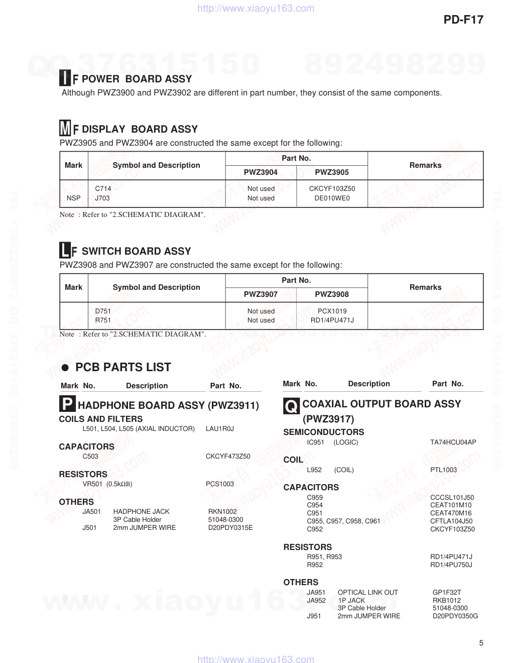 ORDER NO. PIONEER ELECTRONIC CORPORATION 4-1, Meguro 1-Chome, Meguro-ku, Tokyo 153-8654, Japan PIONEER ELECTRONICS SERVICE, INC. P.O. Box 1760, Long Beach, CA 90801-1760, U.S.A. PIONEER ELECTRONIC (EUROPE) N.V. Haven 1087, Keetberglaan 1, 9120 Melsele, Belgium PIONEER ELECTRONICS ASIACENTRE PTE. LTD. 253 Alexandra Road, #04-01, Singapore 159936 � � � � � � � � � �PIONEER ELECTRONIC CORPORATION 1999 KUXQ/CA O AC120V FILE-TYPE COMPACT DISC PLAYER RRV2112 T–ZZR MAR. 1999 Printed in Japan PD-F17 ¶ Refer to the service manual RRV2085 for PD-F958/KUXQ/CA. Remarks Type Model PD-F17 Power Requirement THIS MANUAL IS APPLICABLE TO THE FOLLOWING MODEL(S) AND TYPE(S). 1. CONTRAST OF MISCELLANEOUS PARTS ..... 2 2. SCHEMATIC DIAGRAM .................................... 8 3. PCB CONNECTION DIAGRAM ......................... 9 CONTENTS www. xiaoyu163. com QQ 376315150 9 9 2 8 9 4 2 9 8 TEL 13942296513 9 9 2 8 9 4 2 9 8 0 5 1 5 1 3 6 7 3 Q Q TEL 13942296513 QQ 376315150 892498299 TEL 13942296513 QQ 376315150 892498299 http://www.xiaoyu163.com PD-F17 2 1. CONTRAST OF MISCELLANEOUS PARTS NOTES : ÷ Parts marked by “ NSP ” are generally unavailable because they are not in our Master Spare Parts List. ÷ The mark found on some component parts indicates the importance of the safety factor of the part. Therefore, when replacing, be sure to use parts of identical designation. ÷ Reference Nos. indicate the pages and Nos. in the service manual for the base model. ÷ When ordering resistors, first convert resistance values into code form as shown in the following examples. Ex. 1 When there are 2 effective digits (any digit apart from 0), such as 560 ohm and 47k ohm (tolerance is shown by J = 5%, and K = 10%). 560 Ω = 56 × 10 1 = 561 ................................................... RD1/4PU 5 6 1 J 47k Ω = 47 × 10 3 = 473 .................................................. RD1/4PU 4 7 3 J 0.5 Ω = R50 ...................................................................... RN2H Â 5 0 K 1 Ω = 1R0 ......................................................................... RS1P 1 Â 0 K Ex. 2 When there are 3 effective digits (such as in high precision metal film resistors). 5.62k Ω = 562 × 10 1 = 5621 ........................................... RN1/4PC 5 6 2 1 F 7 CONTRAST TABLE PD-F17/ KUXQ/CA and PD-F958/KUXQ/CA are constructed the same except for the following: Note : ÷ The numbers in the remarks column correspond to the numbers on the exploded diagram, Refer to "EXPLODED VIEWS". EXTERIOR NSP MOTHER BOARD ASSY PWM2269 PWM2272 P6-1 MAIN BOARD ASSY PWZ3895 PWZ3898 P6-2 POWER BOARD ASSY PWZ3900 PWZ3902 P6-3 DISPLAY BOARD ASSY PWZ3904 PWZ3905 P6-4 NSP SWITCH BOARD ASSY PWZ3907 PWZ3908 NSP HEADPHONE BOARD ASSY Not used PWZ3911 No.1 NSP COAXIAL OUTPUT BOARD ASSY Not used PWZ3917 No.2 P6-14 Foot Assy REC1263 Not used P6-18 Rear Base PNA2452 PNA2502 P6-20 Insulator PNW2766 PNW2766 (X2) (X4) P6-46 Name Plate PAM1776 PAN1376 P6-50 Operation Panel PNW2869 PNW2918 P6-52 Hood PNW2865 PNW2919 Headphone Knob Not used PAC1707 No.3 LED Lens Not used PNW2019 No.4 SR Angle Not used PNB1192 No.5 PACKING P3-5 NSP Warranty Card ARY7023 ARY7007 P3-7 Operating Instructions (English) PRB1278 PRB1289 P3-11 Packing Case PHG2337 PHG2374 Ref. No. Remarks PD-F958/ PD-F17/ KUXQ/CA KUXQ/CA Part No. Mark Symbol and Description www. xiaoyu163. com QQ 376315150 9 9 2 8 9 4 2 9 8 TEL 13942296513 9 9 2 8 9 4 2 9 8 0 5 1 5 1 3 6 7 3 Q Q TEL 13942296513 QQ 376315150 892498299 TEL 13942296513 QQ 376315150 892498299 http://www.xiaoyu163.com PD-F17 3 EXPLODED VIEWS EXTERIOR SECTION Rear Base Under Base Screw (IBZ30P080FZK) Screw (IBZ30P060FMC) No.4 Operation Panel lnsulator No.3 No.1 Name Plate No.5 No.2 Screw (IBZ30P060FMC) Screw (BBZ30P080FZK) www. xiaoyu163. com QQ 376315150 9 9 2 8 9 4 2 9 8 TEL 13942296513 9 9 2 8 9 4 2 9 8 0 5 1 5 1 3 6 7 3 Q Q TEL 13942296513 QQ 376315150 892498299 TEL 13942296513 QQ 376315150 892498299 http://www.xiaoyu163.com PD-F17 4 C81, C332, C333, C367, C461 Not used CKCYF103Z50 C475, C477, C4276, C4287 Not used CKCYF103Z50 C185, C323 CKCYF103Z50 Not used C321 CFTLA104J50 Not used C322 CEAT101M10 Not used C331 Not used CEAT470M16 C341, C342 CCCCH120J50 Not used C365, C395, C413– C416, C4277 Not used CFTLA104J50 C388, C389 Not used CCCSL101J50 C401 Not used CEAT471M6R3 C403 Not used CCCCH120J50 C404 Not used CCCCH220J50 C429, C430, C435– C438 Not used CCCSL390J50 C431, C432 Not used CEAT330M16 C481, C482 CCCSL390J50 Not used CN401, CN951 Not used 52147-0310 D451, D452 Not used 1SS254 IC341 Not used PD0236AM IC401 Not used PD2029A IC406 Not used BA15218 JA321 GP1F32T Not used L151, L152, L307, L309, L351 Not used RTF1167 Q451, Q452 Not used DTC124ES Q453, Q454 Not used 2SJ103 R310– R312, R411– R413 Not used RD1/4PU241J R341 RD1/4PU271J Not used R342 RD1/4PU105J Not used R364, R451, R452 Not used RD1/4PU103J R365 RD1/4PU103J Not used R375 RD1/4PU471J RD1/4PU241J R401, R457, R458, R472, R473 Not used RD1/4PU102J R405– R410 Not used RD1/4PU471J R427– R430 Not used RD1/4PU223J R435, R436 Not used RD1/4PU163J R437, R438 RD1/4PU473J RD1/4PU163J R439– R442 RD1/4PU823J RD1/4PU443J R470, R471 Not used RD1/4PU470J R481, R482, R485, R486 RD1/4PU223J Not used R487– R490 RD1/4PU104J Not used X341 PSS1008 Not used X401 Not used PSS1008 Note : Refer to "2.SCHEMATIC DIAGRAM". MAIN BOARD ASSY PWZ3898 and PWZ3895 are constructed the same except for the following: CONTRAST OF PCB ASSEMBLIES Mark Symbol and Description Part No. PWZ3895 PWZ3898 Remarks H F www. xiaoyu163. com QQ 376315150 9 9 2 8 9 4 2 9 8 TEL 13942296513 9 9 2 8 9 4 2 9 8 0 5 1 5 1 3 6 7 3 Q Q TEL 13942296513 QQ 376315150 892498299 TEL 13942296513 QQ 376315150 892498299 http://www.xiaoyu163.com PD-F17 5 COAXIAL OUTPUT BOARD ASSY (PWZ3917) SEMICONDUCTORS IC951 (LOGIC) TA74HCU04AP COIL L952 (COIL) PTL1003 CAPACITORS C959 CCCSL101J50 C954 CEAT101M10 C951 CEAT470M16 C955, C957, C958, C961 CFTLA104J50 C952 CKCYF103Z50 RESISTORS R951, R95