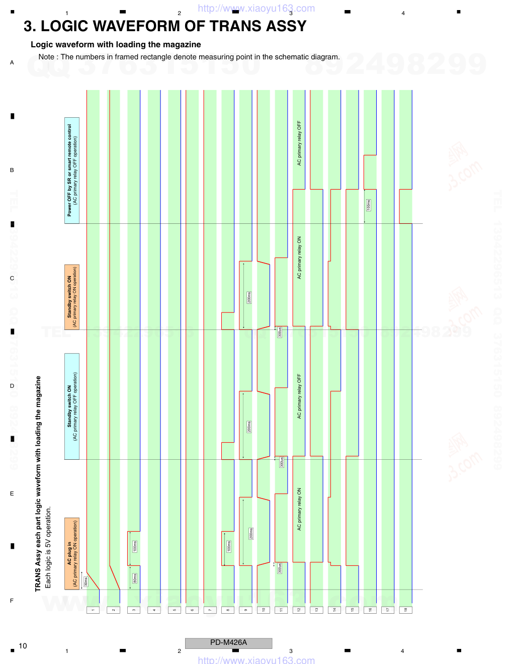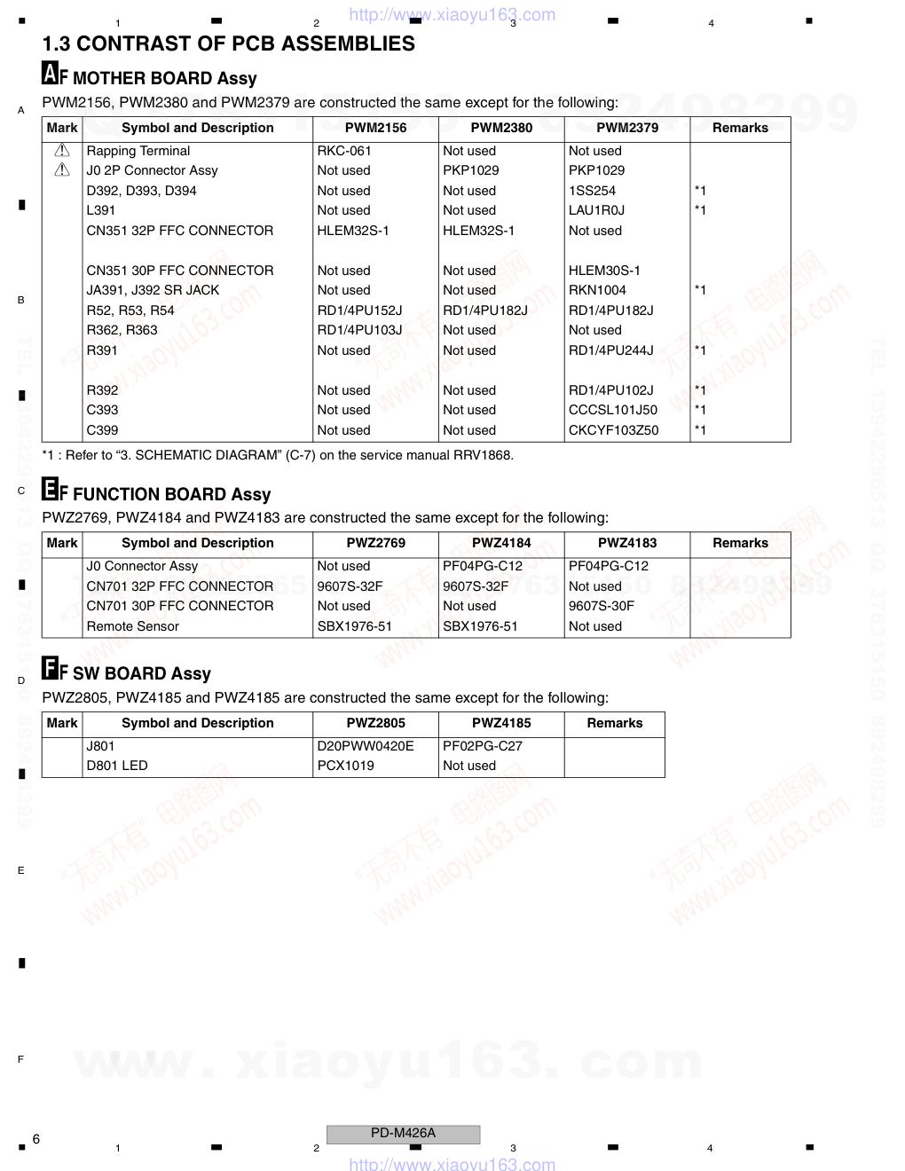 ORDER NO. PIONEER CORPORATION 4-1, Meguro 1-chome, Meguro-ku, Tokyo 153-8654, Japan PIONEER ELECTRONICS (USA) INC. P.O. Box 1760, Long Beach, CA 90801-1760, U.S.A. PIONEER EUROPE NV Haven 1087, Keetberglaan 1, 9120 Melsele, Belgium PIONEER ELECTRONICS ASIACENTRE PTE. LTD. 253 Alexandra Road, #04-01, Singapore 159936 PIONEER CORPORATION 2009 RRV4029 MULTI COMPACT DISC PLAYER PD-M426A PD-M406A THIS MANUAL IS APPLICABLE TO THE FOLLOWING MODEL(S) AND TYPE(S). This service manual should be used together with the following manual(s): For SPECIFICATIONS and PANEL FACILITIES, refer to the operating instructions. Model Type Power Requirement Remarks PD-M426A SYXJ5 AC 220 V to 240 V PD-M406A SYXJ5 AC 220 V to 240 V Model No. Order No. Remarks PD-M426/WYXJ/2 RRV1868 T-ZZZ. NOV. 2009 Printed in Japan www. xiaoyu163. com QQ 376315150 9 9 2 8 9 4 2 9 8 TEL 13942296513 9 9 2 8 9 4 2 9 8 0 5 1 5 1 3 6 7 3 Q Q TEL 13942296513 QQ 376315150 892498299 TEL 13942296513 QQ 376315150 892498299 http://www.xiaoyu163.com PD-M426A 2 1 2 3 4 1 2 3 4 C D F A B E SAFETY INFORMATION REAR This service manual is intended for qualified service technicians ; it is not meant for the casual do-it-yourselfer. Qualified technicians have the necessary test equipment and tools, and have been trainedto properly and safely repair complex products such as those covered by this manual. Improperly performed repairs can adversely affect the safety and reliability of the product and may void the warranty. If you are not qualified to perform the repair of this product properly and safely, you should not risk trying to do so and refer the repair to a qualified service technician. LASER DIODE CHARACTERISTICS MAXIMUM OUTPUT POWER : 7 mW WAVELENGTH : 780 to 785 nm IMPORTANT THIS PIONEER APPARATUS CONTAINS LASER OF CLASS 1. SERVICING OPERATION OF THE APPARATUS SHOULD BE DONE BY A SPECIALLY INSTRUCTED PERSON. Additional Laser Caution 1. Laser Interlock Mechanism The ON/OFF (ON : low level, OFF : high level) status of S601 (LPS1) and S602 (LPS2) switches for detecting the loading state is detected by the system microprocessor, and the design prevents laser diode oscillation except when both switches S601 and S602 are ON (low level or clamped state). Thus, interlock will no longer function if switches S601 (LPS1) and S602 (LPS2) are deliberately shorted (low level). The interlock also does not function in the test mode *. Laser diode oscillation will continue, if pin 33 of CXA1782CQ (IC151) on the MOTHER BOARD ASSY is connected to GND, or pin 50 of IC351 (LDON) is connected to low level (ON), or else the terminals of Q151 are shorted to each other (fault condition). 2. When the cover is opened with the servo mechanism block removed to be turned over, close viewing of the objective lens with the naked eye will cause exposure to a Class 1 laser beam. LABEL CHECK * : Refer to page 22 on the service manual RRV1868. PRW1622 Printed on the Rear Panel www. xiaoyu163. com QQ 376315150 9 9 2 8 9 4 2 9 8 TEL 13942296513 9 9 2 8 9 4 2 9 8 0 5 1 5 1 3 6 7 3 Q Q TEL 13942296513 QQ 376315150 892498299 TEL 13942296513 QQ 376315150 892498299 http://www.xiaoyu163.com PD-M426A 3 5 6 7 8 5 6 7 8 C D F A B E 1. CONTRAST OF MISCELLANEOUS PARTS 1.1 CONTRAST TABLE PD-M426/WYXJ/2, PD-M426A/SYXJ5 and PD-M406A/SYXJ5 are constructed the same except for the following: Mark No. Symbol and Description PD-M426/WYXJ/2 PD-M426A/SYXJ5 PD-M406A/SYXJ5 Remarks PCB ASSEMBLIES NSP 1..SUB BOARD Assy PWX1337 Not used Not used P7-19 2..FUNCTION BOARD Assy PWZ2769 Not used Not used NSP P7-34 2..SW BOARD Assy PWZ2805 Not used Not used 1..SUB BOARD Assy Not used PWX1689 PWX1688 P7-19 2..FUNCTION BOARD Assy Not used PWZ4184 PWZ4183 P7-34 2..SW BOARD Assy Not used PWZ4185 PWZ4185 > P7-20 1..MOTHER BOARD Assy PWM2156 PWM2380 PWM2379 > 1..TRANS Assy Not used PWM2378 PWM2378 No. 1 PACKING SECTION P5-1 Control Cable (for SR)(L=1 m) Not used Not used XDE3063 P5-2 Output Cable (for AUDIO)(L=1 m) PDE1248 XDE3047 XDE3047 P5-3 Remote Control Unit PWW1107 PWW1178 Not used P5-4 Battery Cover PZN1010 PZN1010 Not used P5-5 6-Compact Disc Magazine PXA1575 PXA1617 PXA1617 P5-6 Operating Instructions (De,It,NI,Sv,Es,Pt) PRD1018 Not used Not used P5-6 Operating Instructions (En,Fr) PRE1257 Not used Not used P5-9 CD Packing Case PHG2309 PHG2471 PHG2472 NSP P5-11 Dry Cell Battery (AAA/R03) VEM-022 VEM1049 Not used NSP P5-12 Warranty Card ARY7009 ARY7128 ARY7128 NSP Label(WEEE) Not used ARW7322 Not used IEC65-7 Caution Not used PRM1083 PRM1083 Eu Battery Caution Not used ARM7120 Not used Operating Instructions (En,Fr,De,It,NI,Es,Ru) Not used PRE1301 PRE1301 EXTERIOR SECTION P7-2 32P F.F.C/30V PDD1041 PDD1041 Not used P7-2 30P F.F.C/30V Not used Not used PDD1049 > P7-3 Power Transformer PTT1236 PTT1365 PTT1365 Parts marked by "NSP" are generally unavailable because they are not in our Master Spare Parts List. The mark found on some component parts indicates the importance of the safety factor of the part. Therefore, when replacing, be sure to use parts of identical designation. Screws adjacent to mark on product are used for disassembly. For the applying amount of lubricants or glue, follow the instructions in this manual. (In the case of no amount instructions, apply as you think it appropriate.) Nos. indicate the pages and Nos. in the service manual for the base model. NOTES: When ordering resistors, first convert resistance values into code form as shown in the following examples. Ex.1 When there are 2 effective digits (any digit apart from 0), such as 560 ohm and 47k ohm (tolerance is shown by J=5%, and K=10%). Ex.2 When there are 3 effective digits (such as in high precision metal film resistors). 5 6 1 4 7 3 R 5 0 1 R 0 RD1/4PU J RD1/4PU J RN2H K RS1P K 56 x 101 47 x 103 R50 1R0 561 473 RN1/4PC F 562 x 101 5621 5 2 6 1 www. xiaoyu163. com QQ 376315150 9 9 2 8 9 4 2 9 8 TEL 13942296513 9 9 2 8 9 4 2 9 8 0 5 1 5 1 3 6 7 3 Q Q TEL 13942296513 QQ 376315150 892498299 TEL 13942296513 QQ 376315150 892498299 http