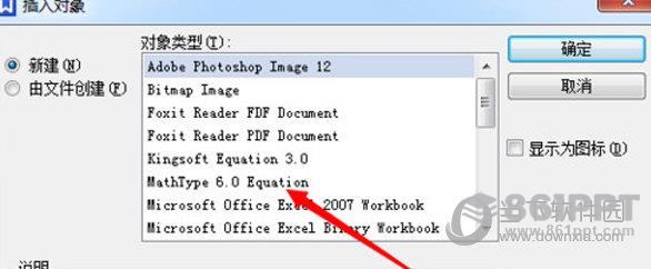 点击对象,弹出以下界面,选择Mathtype,确定数学公式编辑界面。