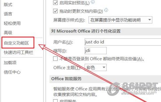 在弹出word选项页面的左侧找到并单击[自定义功能区]