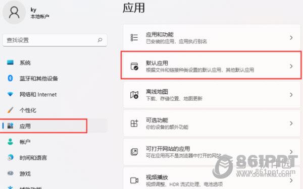 Windows 设置窗口、左侧边栏、点击应用程序、右侧默认应用程序(默认应用程序根据文件和链接类型设置,其他默认应用程序);
