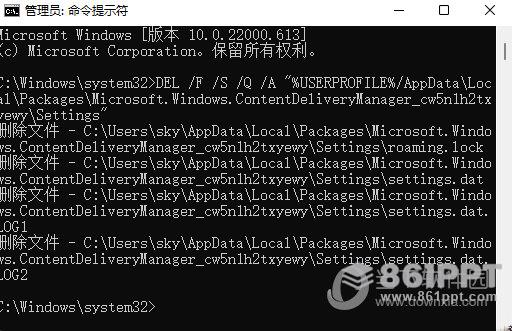 DEL /F /S /Q /A “%USERPROFILE%/AppData\Local\Packages\Microsoft.Windows.ContentDeliveryManager_cw5n1h2txyewy\Settings”