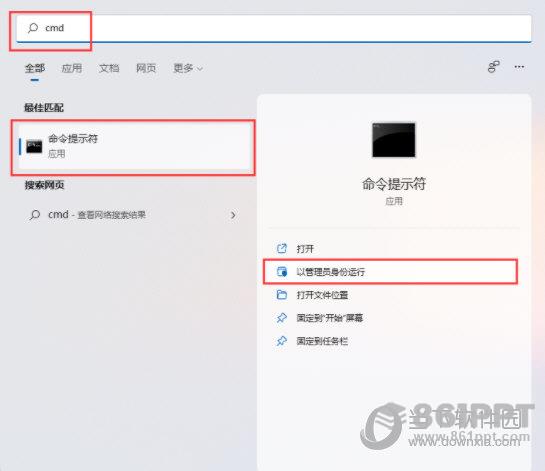 按键盘 Win + S 组合键,或点击任务栏上的搜索图标,打开Windows 搜索窗口,顶部搜索框,输入cmd,作为管理员点击操作命令提示符应用程序。
