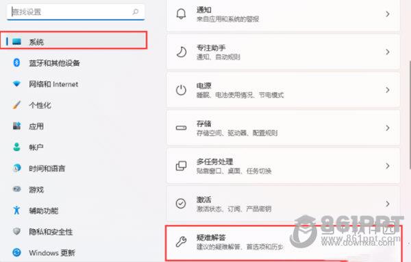 Windows 设置窗口,左侧选择【系统】,右侧点击【疑难答案(推荐疑难答案、首选和历史记录)】;
