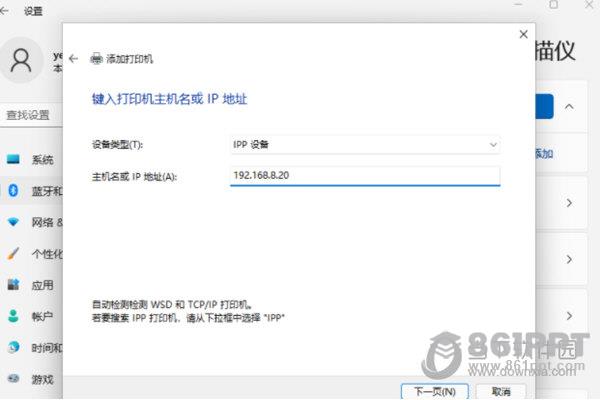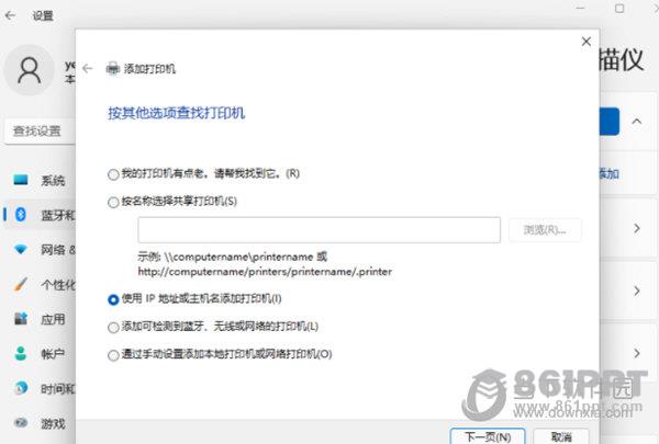添加打印机窗口,可选择[使用] IP 添加打印机地址或主机名称];