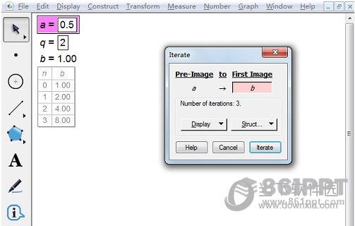 步骤三 选择参数a,选择“变换”——“迭代”命令,弹出迭代对话框,用鼠标指针选择计算值B,定义为映射关系的初始图像,按下“迭代”按钮,即获得迭代数据表,表中的数据是等比数列an=2n的项目。