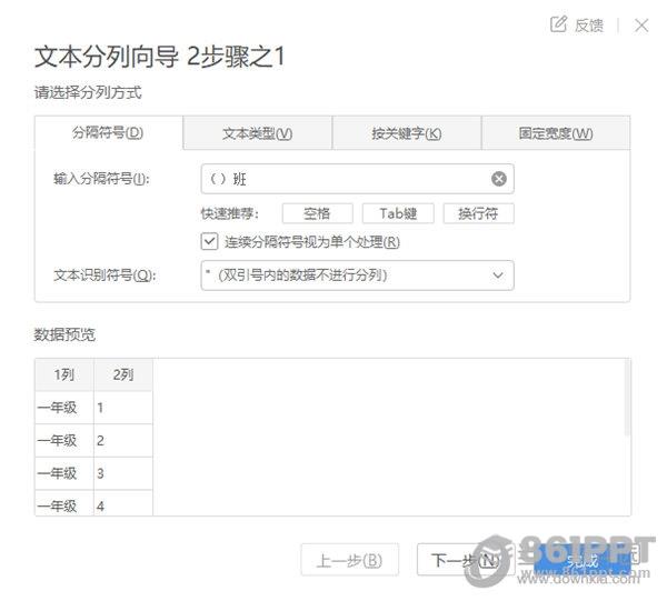 在这里输入分隔符号,如输入“()班”,在下方「数据预览」可以预览分列效果,设置后点击「确定」按钮即可完成。