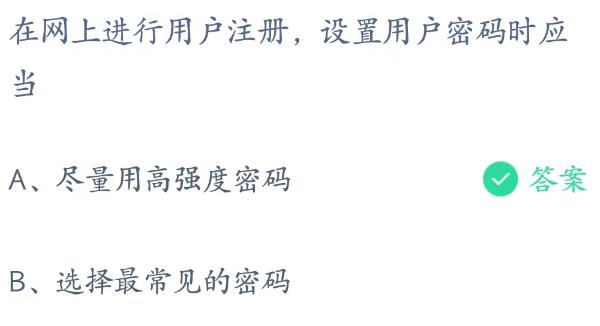 在线上进行申请注册设定账户密码时应该?标准答案尽量用高韧性登陆密码 。这也是支付宝钱包小蚂蚁庄园小课堂2023年4月15日题目及答案。目前世界应用数最多的密码“123456”,这种登陆密码十分容易被破译,很容易导致个人信息安全财产安全损害,我们在进行密码设置时,一定要尽可能的选用高韧性登陆密码,强密码规定最少8字符之上,含英文字母、数据、特殊字符以内。