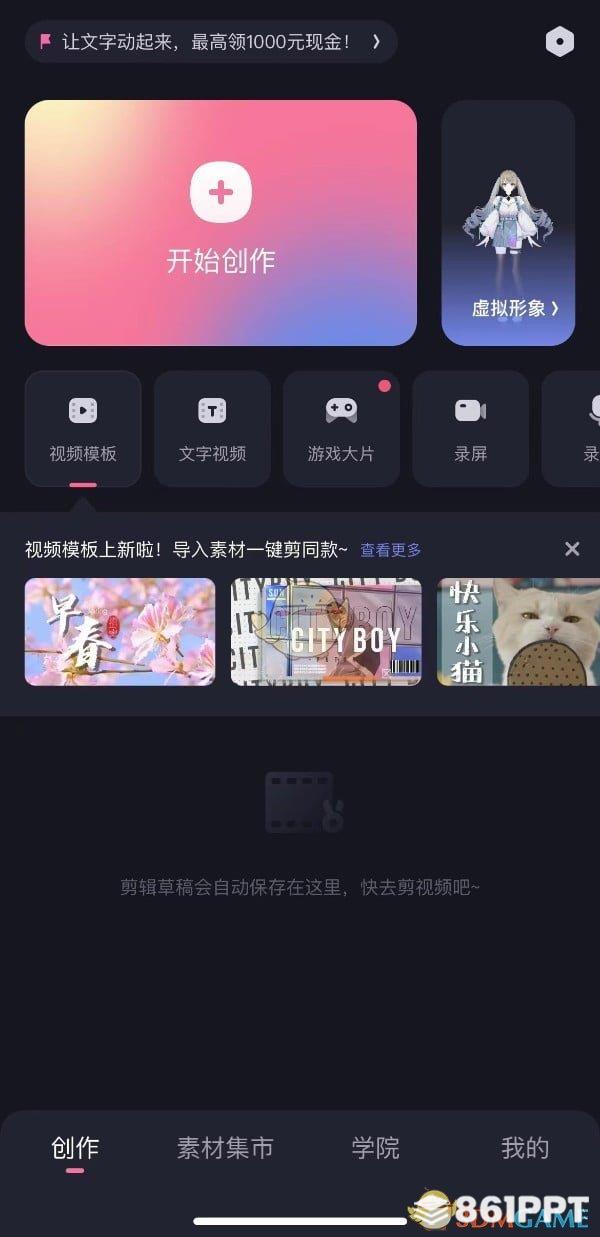 进入必剪的主界面后,点一下应用【虚拟人物】。