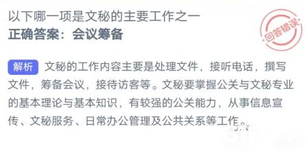 2023支付宝钱包蚂蚁新村4月14的题早已升级了,今日的题为:下列哪一项是文秘人员主要工作内容之一?正确答案是哪些?人力资源管理或是会议筹备呢?有很多小伙伴或许还不是很清楚。小编就给大家带来了标准答案共享,希望能够帮助到你。