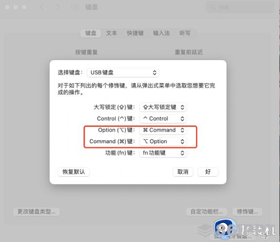 5、先挑选USB电脑键盘,随后调整mac内置键盘的按键与外接键盘的按键映射关联就可以。