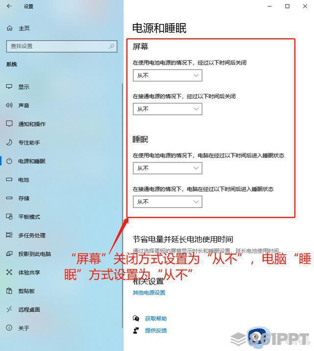 4、进到“电源装置睡眠质量”属性栏,使用充电电池开关电源前提下和插上电源的情形下,设定“显示屏”关掉形式为“从来不”,设置电脑“睡眠质量”形式为“从来不”。