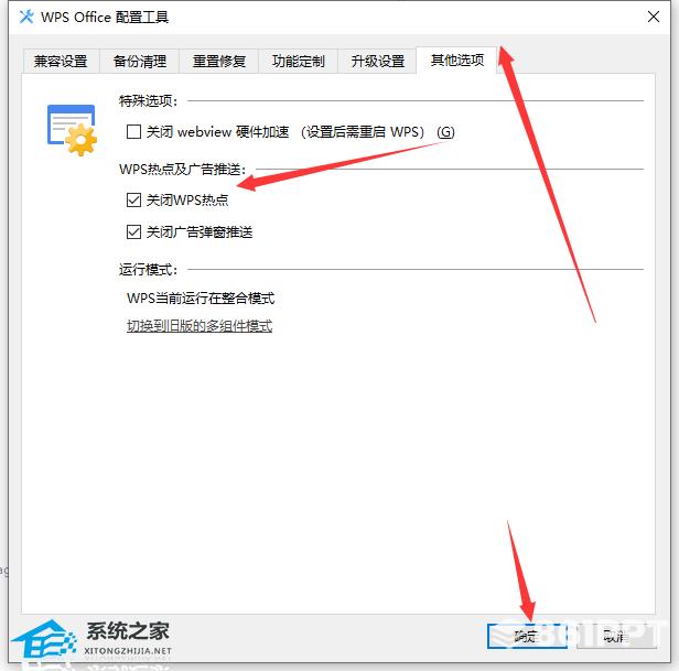 4、进入新界面,点击上面“其他选项”选项卡,找到其中的“关闭WPS热点”,勾选左侧的小方框,点击确定保存。