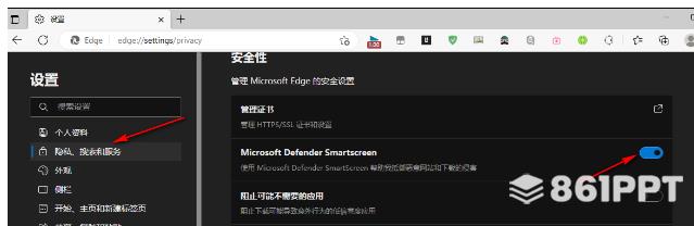 2、点击设置页面上的隐私、搜索和服务功能。点击右侧的Windows Defender SmartSrcen选项。