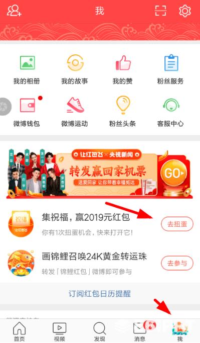 1、进入微博软件首页后,需要选择页面右下角的按钮打开个人中心,通过下面的按钮打开个人中心“收集祝福,赢2019元红包”横幅进入活动界面。