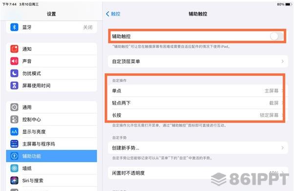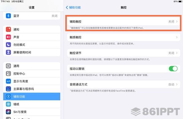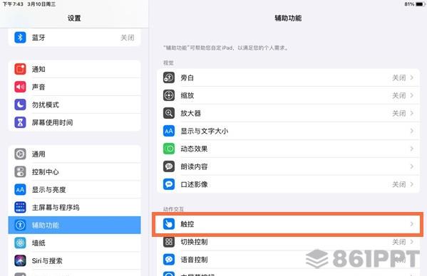 1、打开设置,点击[辅助功能],选择[触摸]。