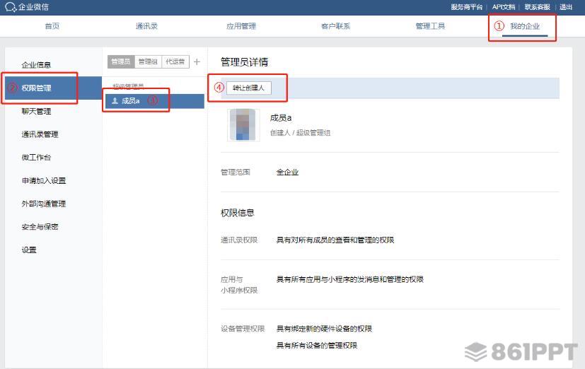 登录企业微信管理后台,在“我的企业-权限管理”处转让创始人。