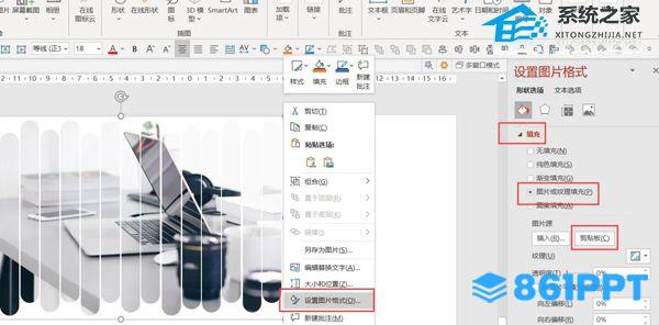 6、右键单击形状-设置形状格式-图片或纹理填充-剪贴板-将图片导入形状。