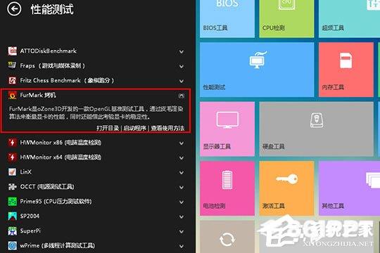 2、在性能测试的功能栏中找到它“FurMark烤机”功能,这就是我们今天所说的烤机的主角,它可以通过毛皮渲染来测试显卡的性能,从而测试显卡与整个计算机设备的整体兼容性和稳定性,点击“启动程序”即可;
