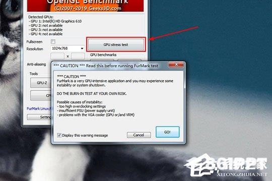 4、所有设置完成后,单击“GPU stress test”开始设置选项,点击“GO”之后就可以开始期待已久的烤机测试了;