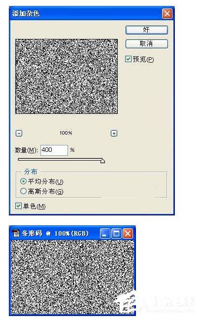 2、我们执行||命令打开滤镜对话框,设置“数量”为400%;“分布”为“平均分布”;检查多选框,完成后按下按钮,为图像添加杂点底纹
