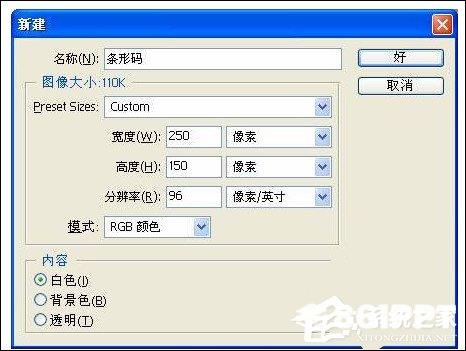 1、我们执行菜单中的命令,或者按下快捷键Ctrl+N,打开对话框,输入图像“名称”为“条形码”,是图像“宽度”设置为250像素;“高度”图像设置为150像素;“模式”设置为“RGB颜色”。按下完成后的按钮