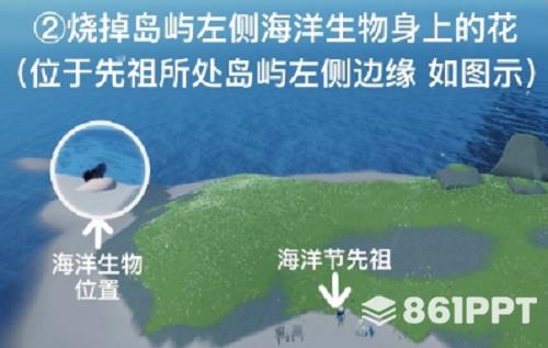 2.烧毁海岛左边海洋动物的身上的花朵,坐落于先人所在海岛左边边沿如图例。