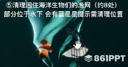 5.清除缠住海洋动物的捕鱼网,约8处,一部分坐落于水中会出现蓝星辰提醒需清除部位。